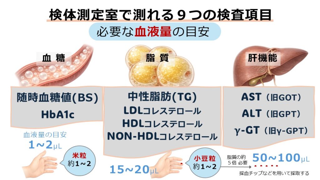 一般に、検体測定室で普及している「血糖(2項目)」や「脂質(4項目)」と比べると、肝機能(3項目)の測定には、より多くの血液量が必要となるのが大きな特徴です。通常、血糖測定では米粒1つ分ほど(約1~2μL)、脂質測定では小豆粒1つ分ほど(約15~20μL)が目安となるのに対し、肝機能測定ではその5倍以上の量(約50~100μL)を要します。