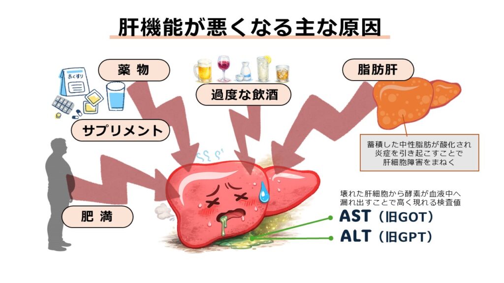 肝機能の数値が上昇する背景には、日常生活の中に多くの原因が潜んでいます。代表的なものには、過度な飲酒や肥満、そして意外な盲点となるのが、薬やサプリメントによる影響です。