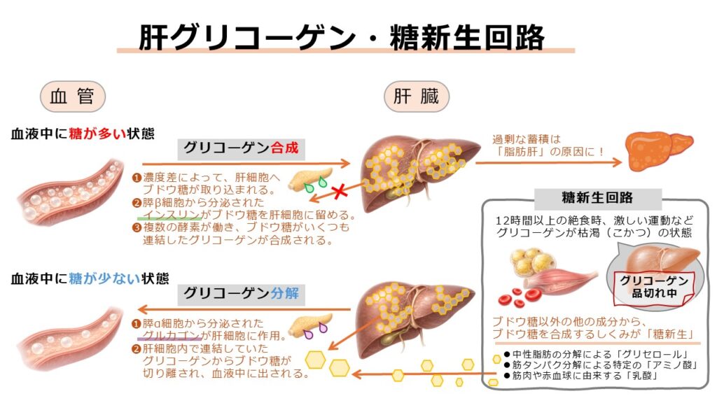 また、肝臓にはさらに別の「糖の合成経路(糖新生回路)」も存在します。その経路は、脂肪組織の分解によって生じるグリセロールや、特定のアミノ酸、乳酸など、糖を作るための材料があればブドウ糖を産生することが可能です。十分な量の材料があれば、ヒトが1日に必要とするブドウ糖の全量(135g)を補うことも難しくありません。