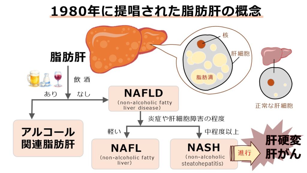 これまで脂肪肝は、過度な飲酒による「アルコール関連脂肪肝」と、飲酒に起因しない「非アルコール性脂肪性肝障害(NAFLD)※」の2つに大別されてきました。これは1980年、Ludwigらが飲酒習慣のない人でもアルコール関連脂肪肝と似たような肝組織の症状が見られることを報告し、提唱した概念です。