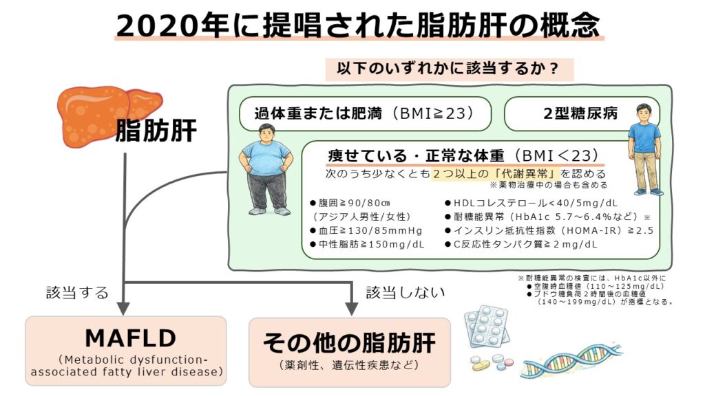 MAFLDは、脂肪肝に加え「肥満」「2型糖尿病」「2種類以上の代謝異常」のいずれかを伴う場合に診断されます。脂肪肝をもつ日本人の約25%は肥満ではない人たちであるため、「2種類以上の代謝異常」が診断基準に加わったことは注目すべき点と言えるでしょう。